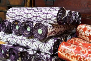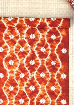 今回の注目は、おめでたい扇面の紫根染名古屋帯地と絞りのグラデーションが美しい茜染名古屋帯地。
